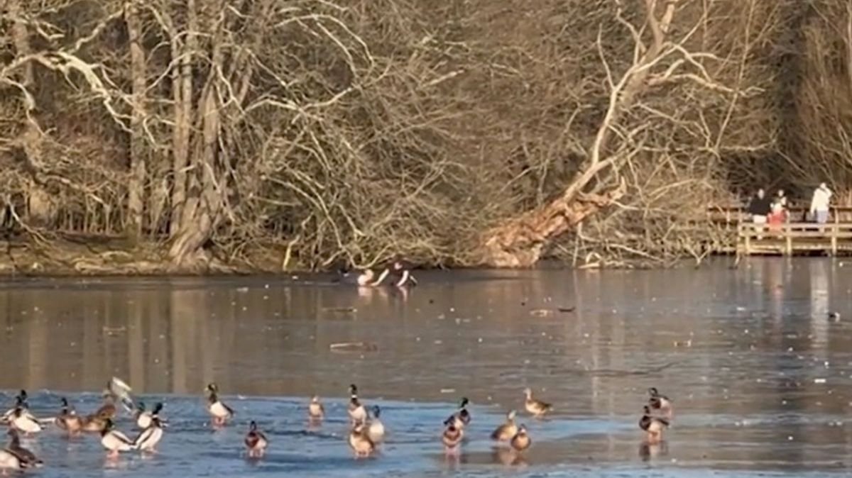 In a heart-stopping moment captured on video, an unidentified hero braved the frozen surface of a lake to rescue a man who had fallen into the icy waters while attempting to save his dog at Connaught Water in Epping Forest, Essex. The incident unfolded as the plummeting temperatures in the UK led to the lake freezing over, prompting the pet to wander onto the dangerously icy surface, leading to the dramatic rescue mission on Sunday.